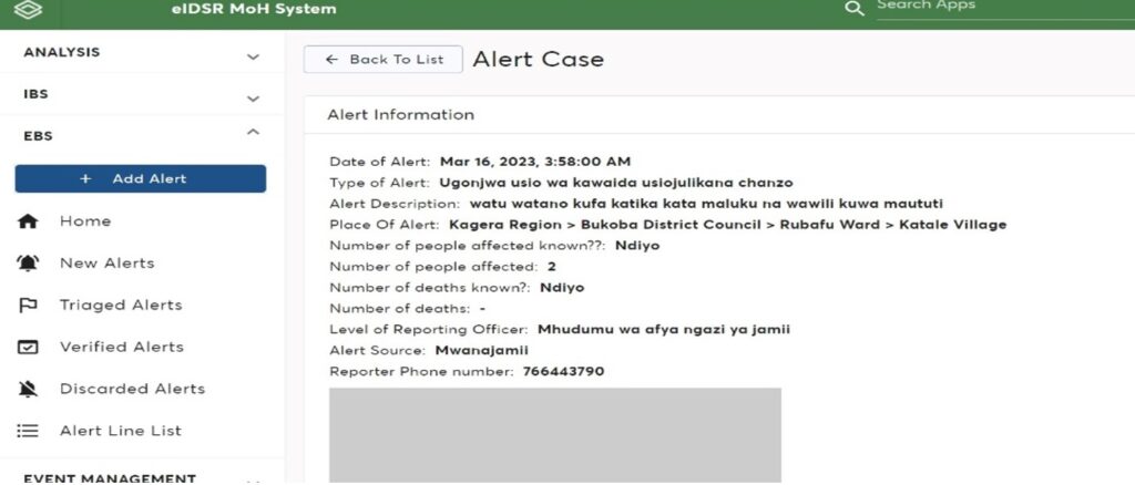 The electronic Event-Based Surveillance (eEBS) system links community observations directly to national response teams, particularly in high-risk regions like Kagera, which borders Uganda. CHWs equipped with smartphones and trained in digital surveillance transform rumours into real-time alerts. In Kagera alone, nearly 500 CHWs now operate this way. That night, she filled out a structured alert: location, symptoms, and death toll. Within hours, district and national health authorities mobilized.