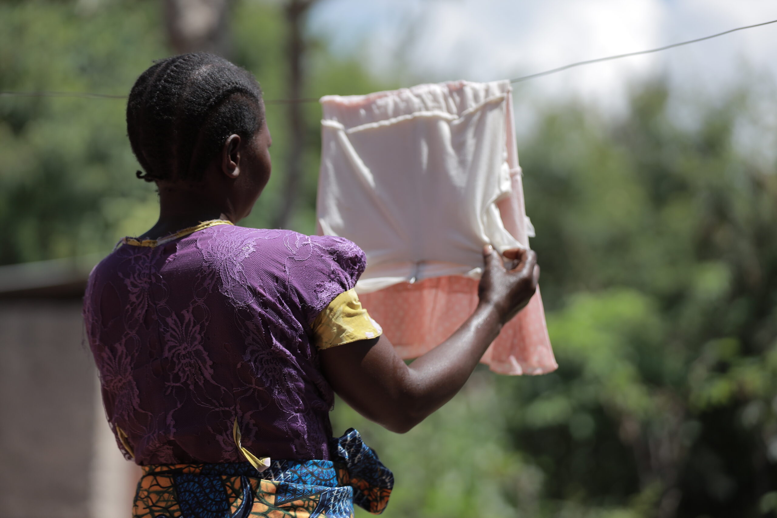 Luli James hangs laundry in Inaro Village, Simiyu Region. © Amref Tanzania.