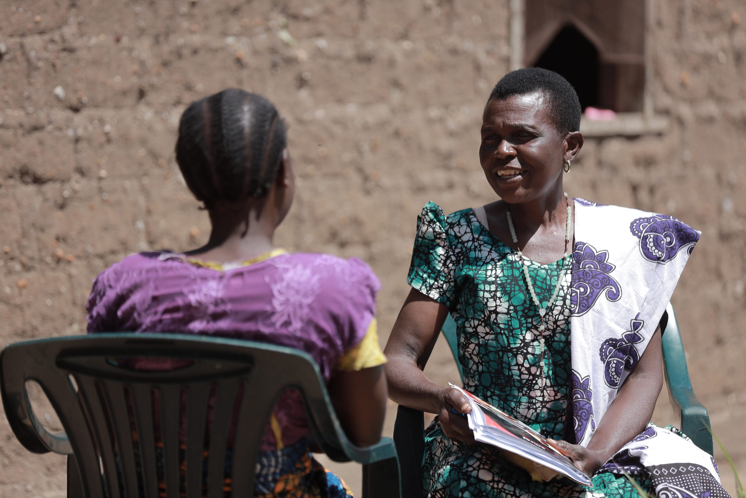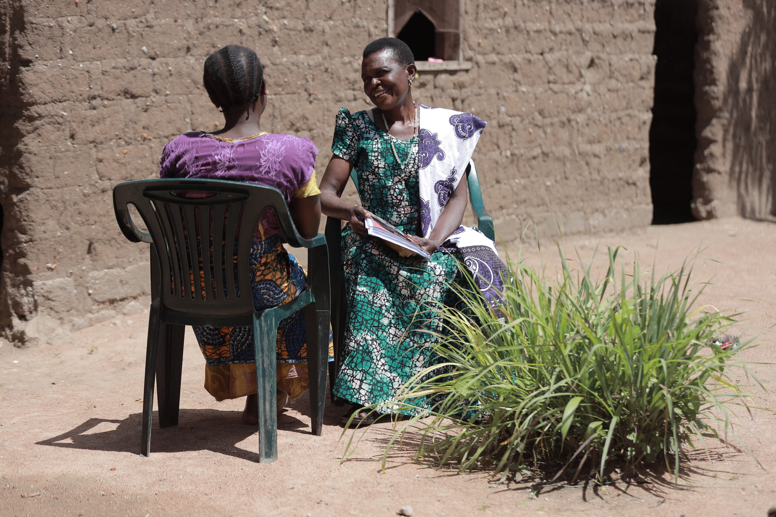 Agnes Bizulu (Right), CHW speaks with Luli James (Left) during a household visit in Inaro village, Itilima District Simiyu Region. © Amref Tanzania.